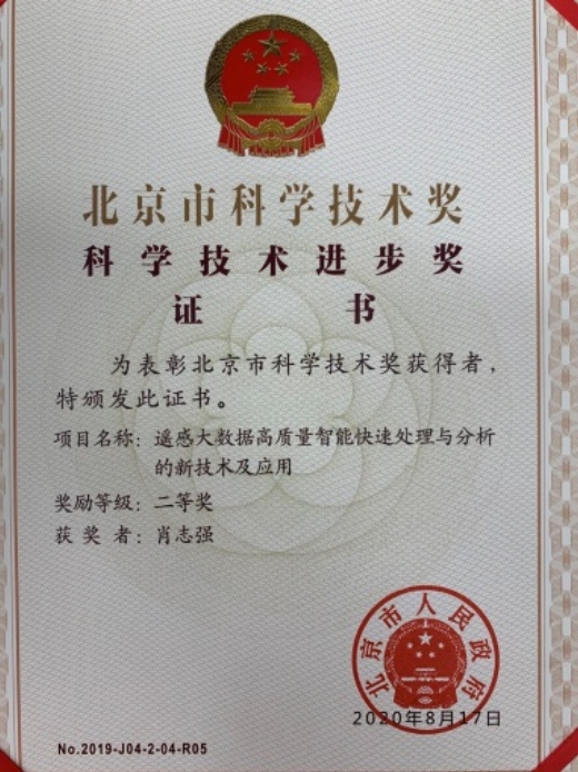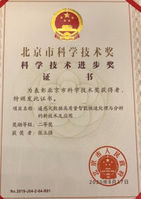 学部张立强、唐宏、肖志强和我校数学科学学院刘君等老师联合北京航天宏图信息技术股份有限公司的科研项目“遥感大数据高质量智能快速处理与分析的新技术及应用”荣获2019年北京市科学技术进步奖二等奖。在2020年9月10日召开的北京市科技奖励大会上,张立强老师作为获奖代表上台领奖。