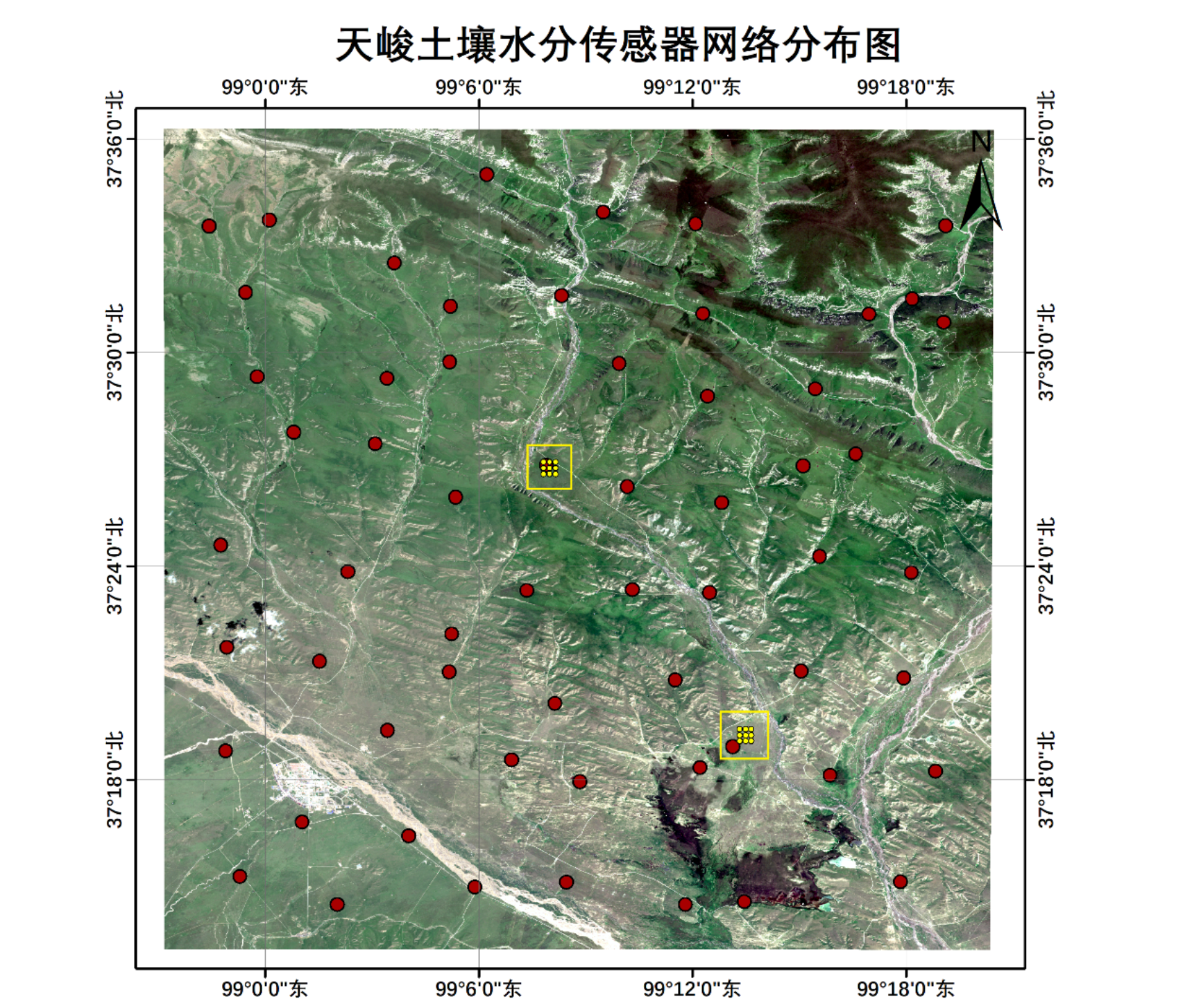 (图中红色点为大区域土壤水分传感器网络,黄色点为加密观测)