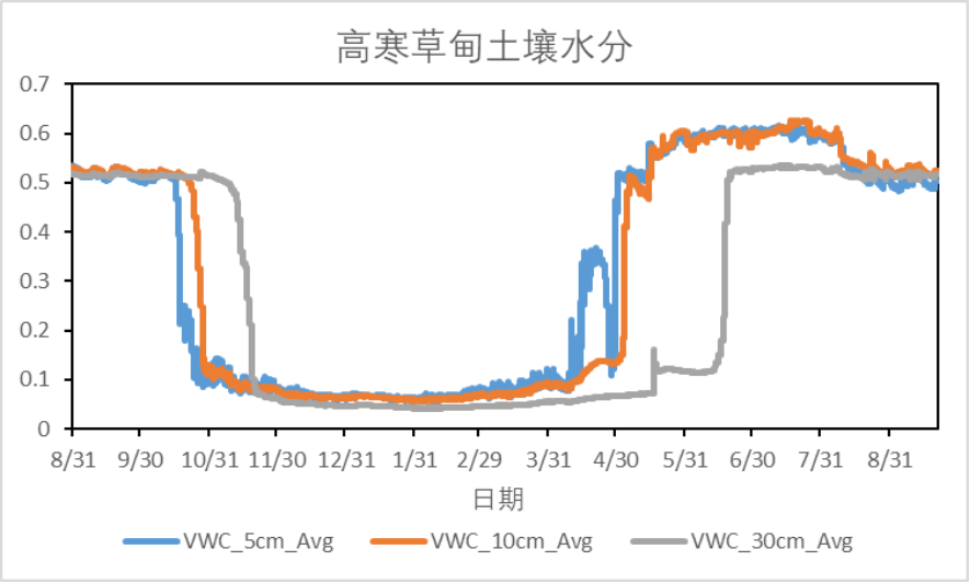 本次数据采集共获得了58个点位的土壤水分数据。另有一个点位进水,一个点位仪器被破坏,已进行修复。已采集的土壤水分数据质量良好,能够充分反映该区域的土壤水分时空变化趋势,特别是高原地区土壤冻融变化特征(图2)。
