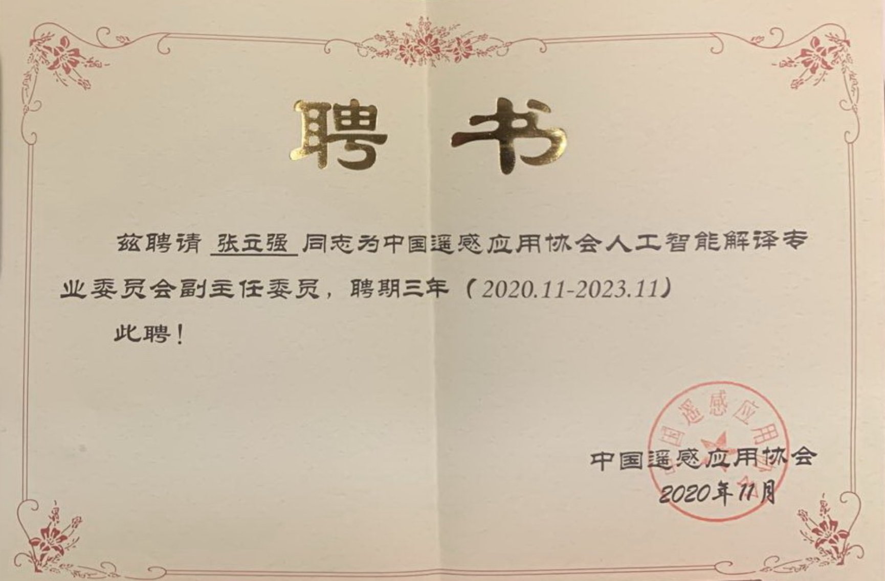 张立强教授被聘为中国遥感应用协会人工智能解译专业委员会副主任委员