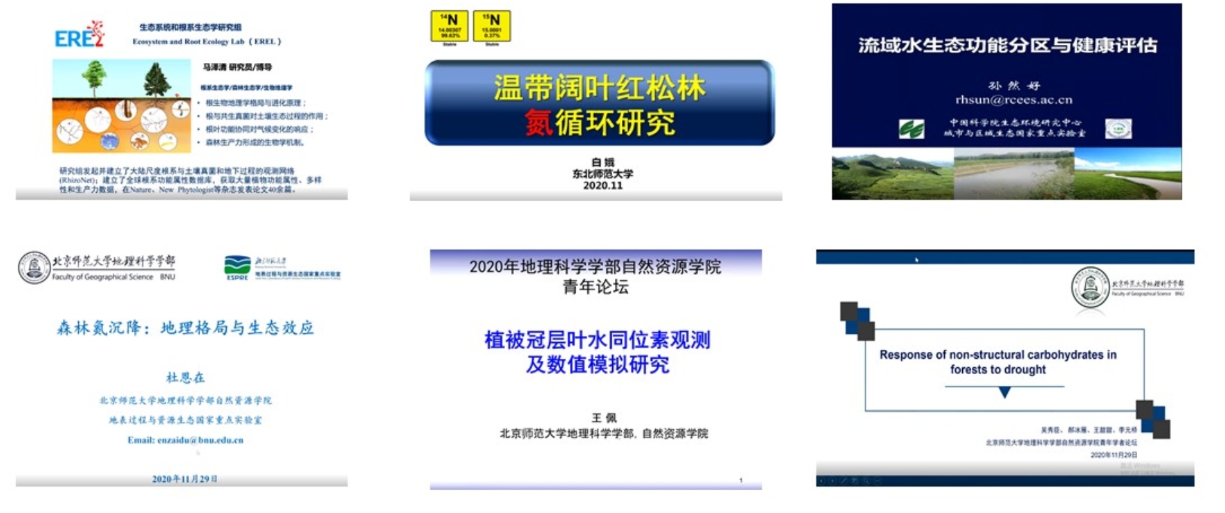 老司机论坛 自然资源学院2020年度青年学者论坛暨第四届研究生学术能力竞赛于2020年11月29日以线上形式成功举行,吸引了校内外80余人在线参加。上午的青年学者论坛开幕式由吴秀臣教授主持。首先,老司机论坛 自然资源学院院长李小雁教授致辞,介绍了自然资源学院优秀青年人才委员会的发展历程并对此次活动进行了寄语。青年学者论坛邀请到了中国科学院地理科学与资源研究所马泽清研究员,中国科学院生态环境研究中心孙然好研究员以及东北师范大学白娥教授等三位基金委优秀青年科学基金获得者作了特邀学术报告。三位专家分别以“植物根系生物地理格局及进化原理”、“流域水生态功能分区与健康评估”及“温带阔叶红松林氮循环研究”为题针对大尺度根系结构和功能的生物地理分布格局及控制机理、海河流域水生态功能分区及生态健康评估及典型温带阔叶红松林微生物残体氮循环过程作了精彩报告。同时,老司机论坛 自然资源学院杜恩在副教授、王佩副教授及吴秀臣教授分别以“森林氮沉降:格局与效应”、“植被冠层叶水同位素观测及数值模拟研究”和“森林非结构性碳动态对干旱的响应”为题与广大师生分享了最新的科研成果。与会师生就热点和前沿问题积极参与讨论,现场气氛热烈。