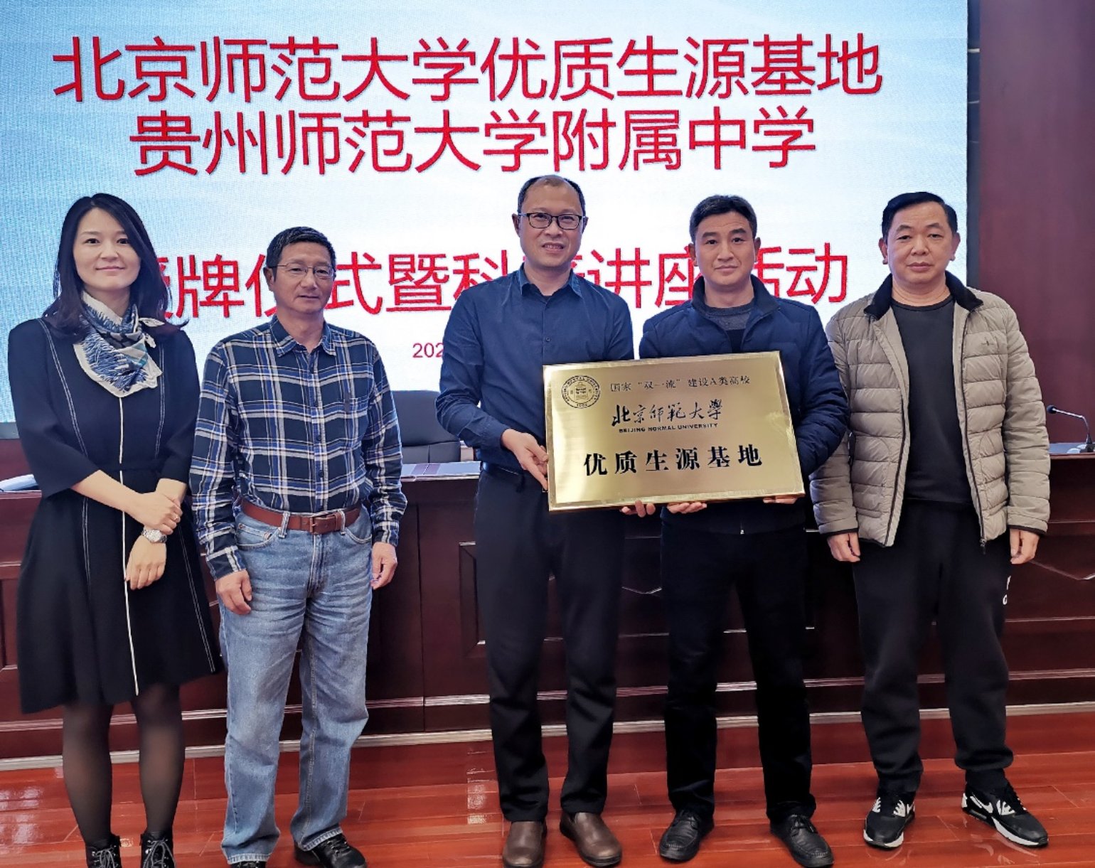12月1日,邱维理、叶爱中两位老师赴贵州省铜仁第一中学新建优质生源基地。铜仁第一中学党委委员、纪委书记李茂潮,政教处主任张世界对两位老师表示了热烈的欢迎。在高二高三年级400多位同学的见证下,双方完成了优质生源基地签约授牌仪式,邱维理老师作了科普讲座,叶爱中老师作了招生宣讲,详细介绍了北京师范大学的办学定位、近年录取情况等。