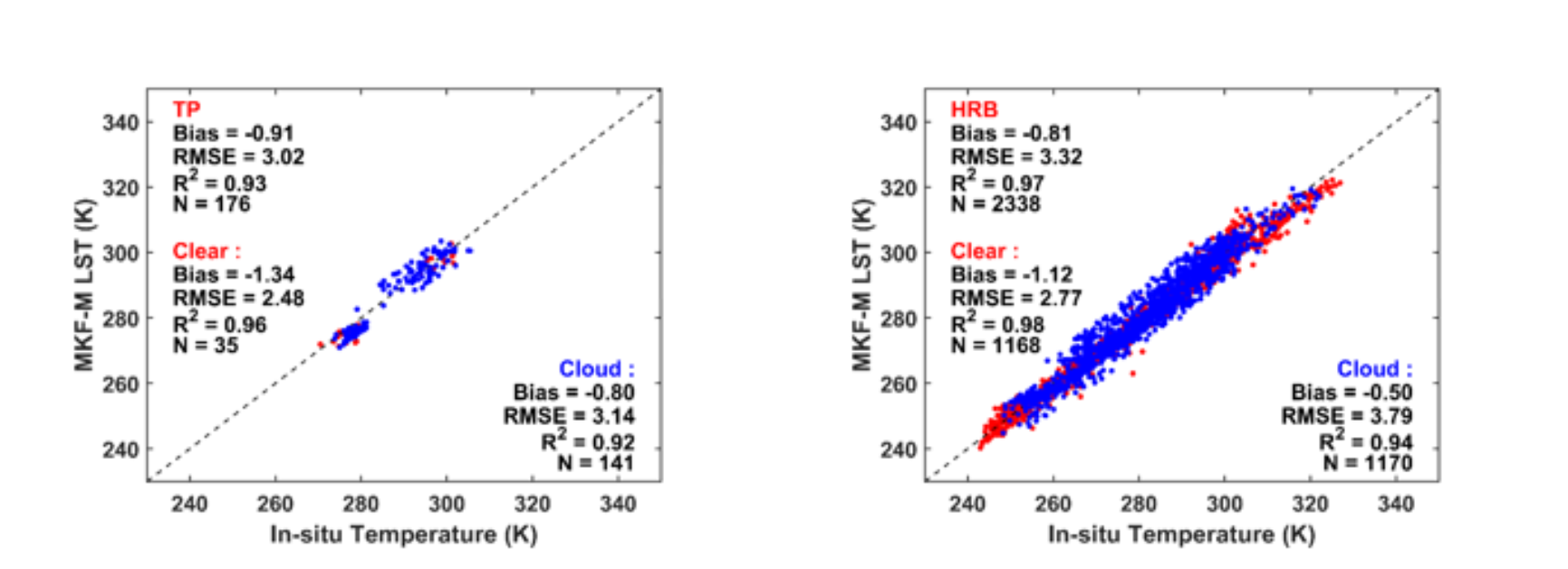 第二项研究题为“A new land surface temperature fusion strategy based on cumulative distribution function matching and multiresolution Kalman filtering”,发表在Remote Sensing of Environment。用户对于高空间分辨率、空间完整(无缝)地表温度产品具有强烈的需求。作者认为,融合由真实观测反演、具有优势互补的热红外和微波地表温度,是切实可行的实现路径。为此,基于前期发展的微波地表温度反演算法和降尺度算法,该研究提出了一种新的融合策略,融合改进的MODIS地表温度和反演的微波地表温度,获得中国区域1公里、无缝地表温度产品。图3展示的是生成的中国区域1公里、无缝地表温度,图4是对应的MODIS地表温度产品,两者具有一致的时空趋势。图5展示的是地面验证精度。该方法已用于生成中国区域2002-2020地表温度产品。