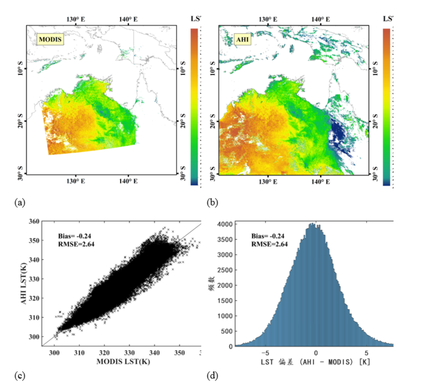 图2 AHI(2016年1月3日,04:40UTC)和MYD21(2016年1月3日,04:45UTC)地表温度在澳大利亚北部的对比。(a) MYD21地表温度空间分布;(b) AHI的地表温度空间分布; (c) AHI和MYD21地表温度散点图;(d) 地表温度偏差分布直方图。