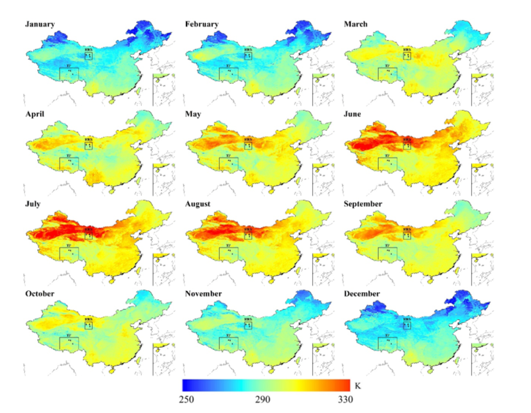 图3 由融合方法生成的2014年每个月15日白天的地表温度。