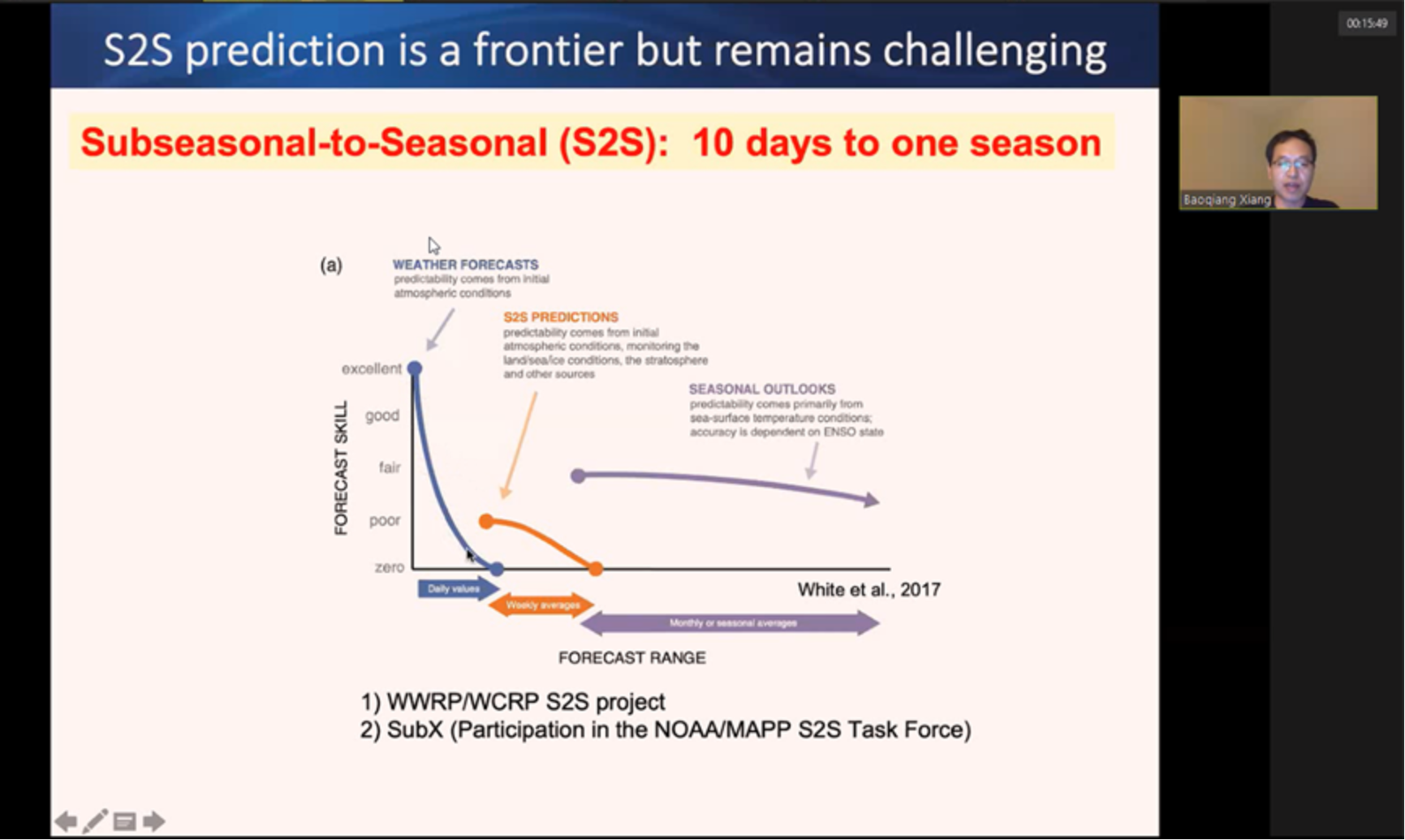 项宝强研究员从数值天气预报模式的发展历史讲起,指出了次季节时间尺度上的气候预测是近年来的研究热点与难点。次季节尺度如同一座桥梁,弥补了天气预报到季节预测之间的缝隙,是建立无缝隙预报系统以及主动防灾减灾的关键。但相对于发展较完善的天气和季节尺度预报,介于这两个时间尺度之间的次季节尺度的预技巧较差,被誉为是一个“预测沙漠”。