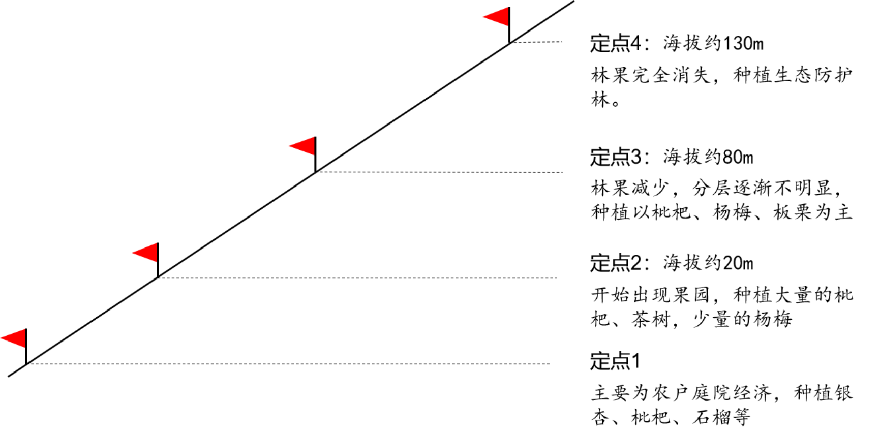为了进一步了解东山镇的农业生产情况,朱华晟老师带学生们观察了垂直层面上不同尺度的农业景观。从湖湾路到莫厘峰顶,农业生产逐渐由精细到粗放。海拔较低时农户倾向于种植规模较大的人工枇杷林、林下茶,以获得较高的经济收益;海拔较高时农户对农用地的管理强度减少,农业景观以杨梅树、板栗树为主;再上升至一定高度,生态防护林替代了人工种植的农产品。东山镇垂直尺度的土地利用变化让学生们切身感受到在市场、制度、技术等作用下,在自然基底上形成的地带性农业生产格局。