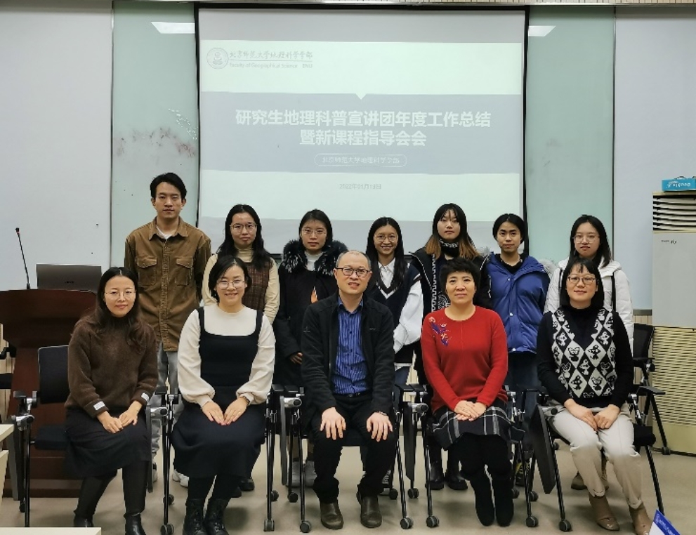 2022年2月13日下午, 研究生科普宣讲团年度总结暨新课程指导会在生地楼148会议室成功举办。会议邀请了地理学部常务副部长吴云峰、德胜中学党委书记及地理学科带头人李燕玲、北师大二附中未来科技城学校黄文敏、地理学部课程与教学论教师高翠微、地理学部辅导员石月婵五位教师进行指导。会议由科普宣讲团林海清同学主持。