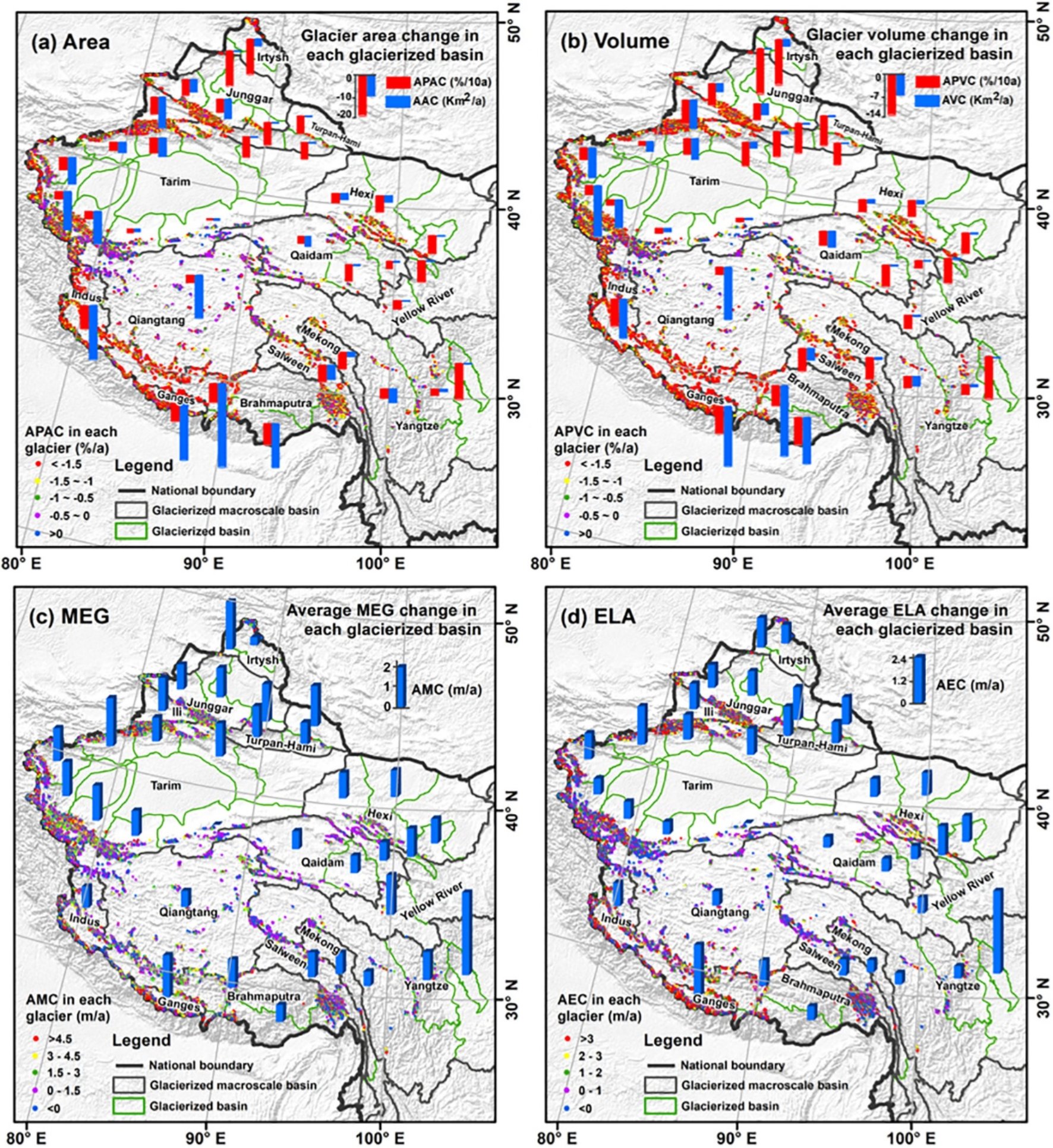图3 中国两次冰川编目期间单一冰川和流域尺度冰川面积、储量、中值海拔高度和平衡线高度变化的时空格局