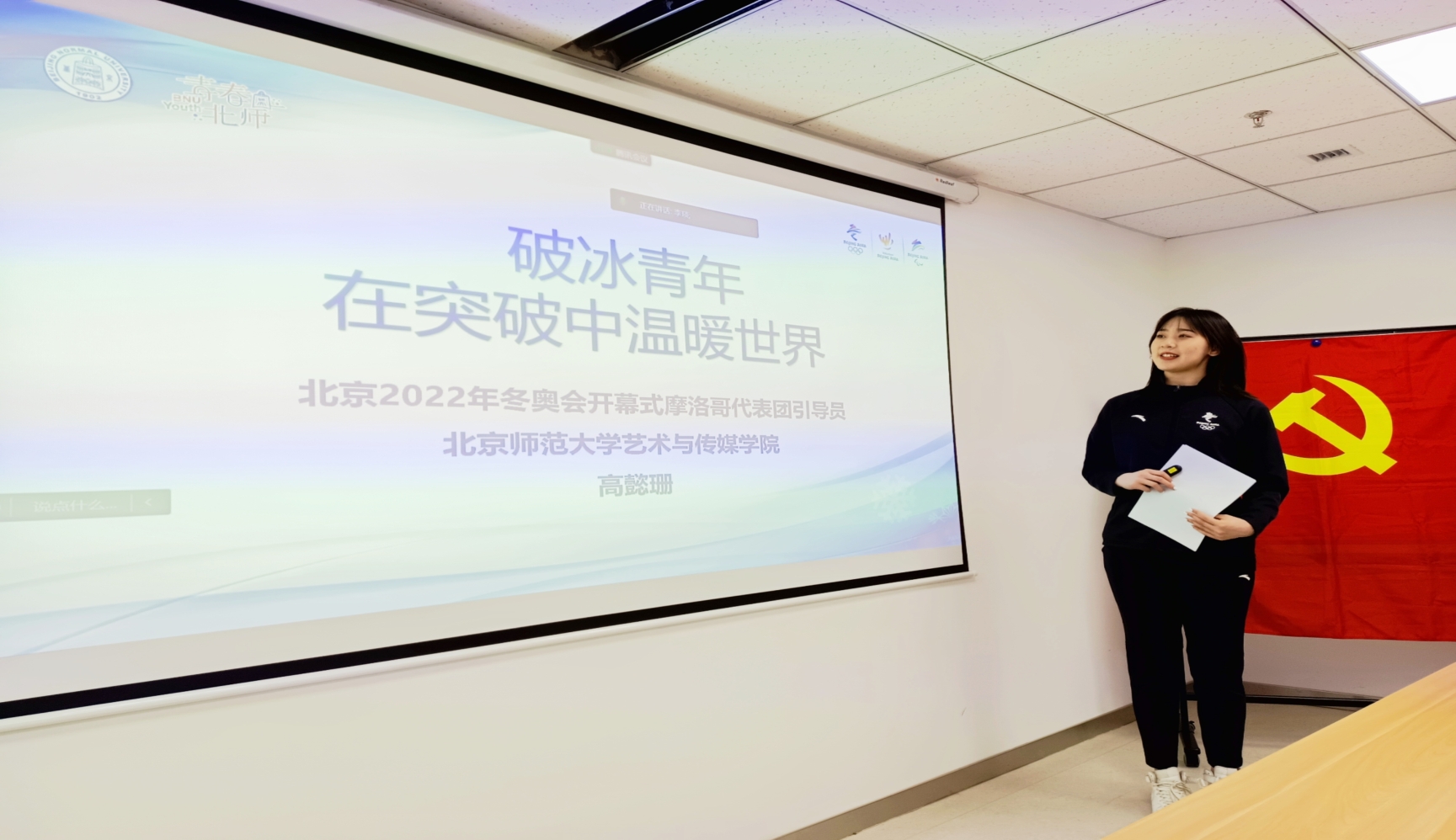 会议的第二阶段,党支部邀请了北京2022年冬奥会开幕式摩洛哥代表团引导员、老司机论坛 艺术与传媒学院本科生高懿珊分享了她的冬奥故事。作为老司机论坛 年轻学子和冬奥会志愿者的优秀代表,高懿珊分享了会前会上的志愿服务与心得感受、场内场外热血热泪的宝贵经历。高懿珊用实际行动践行了“一起向未来”的奥运理念,向各国参会人员和世界观众展示了老司机论坛 和中国青年的精神风采。