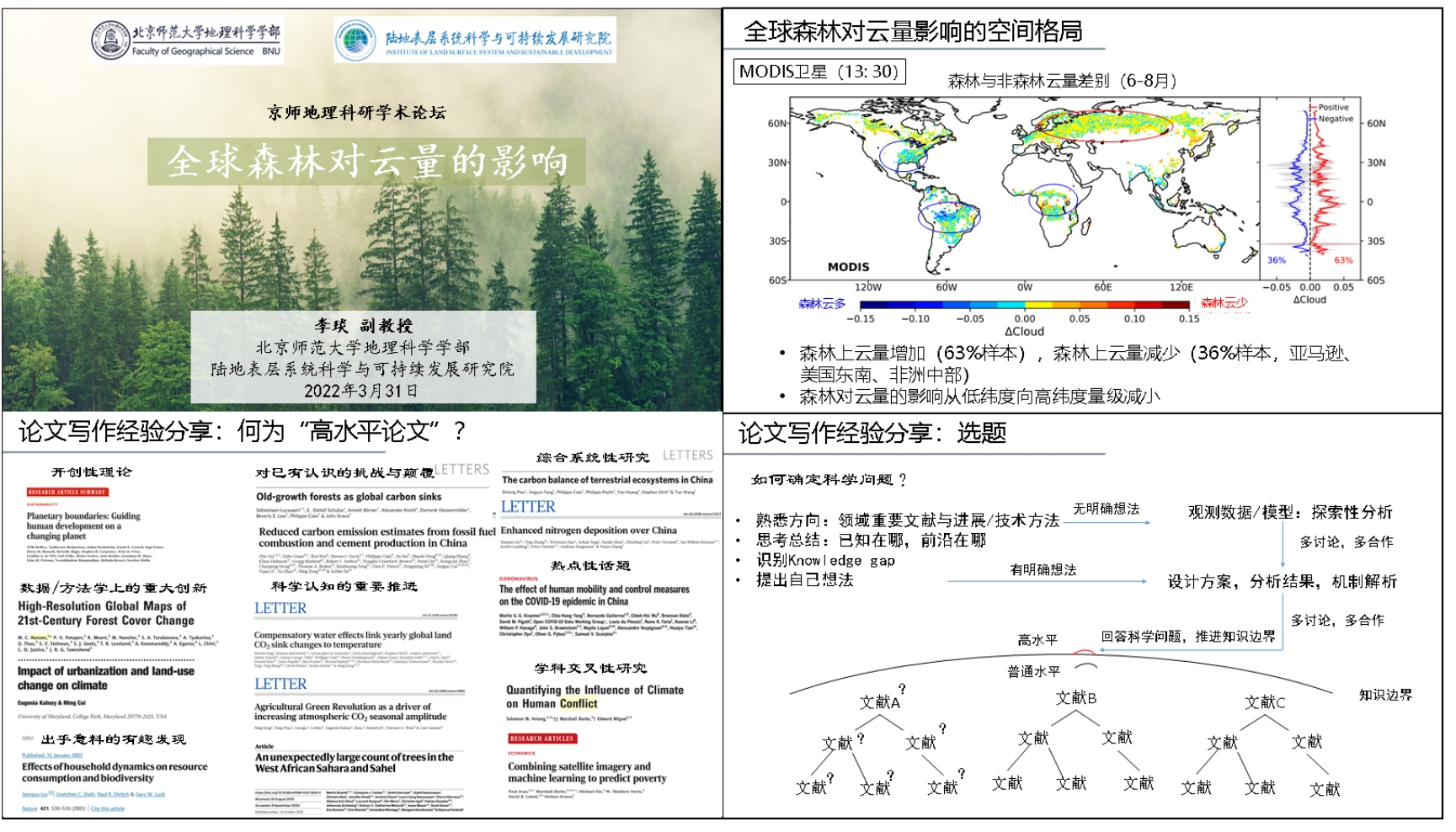 李琰副教授首先以近期发表在Nature Communications论文《Contrasting impacts of forests on cloud cover based on satellite observations》(基于卫星遥感的全球森林对云量的影响)为题,作了学术报告(文章链接://doi.org/10.1038/s41467-022-28161-7)。报告中,李琰老师介绍研究中发现的森林对云量的影响在空间上的异质性,即相对于非森林地区,大多温带和北方森林会带来云量增加,而亚马逊、非洲中部和美国东南部等地区森林会带来云量减少,且2000-2018间全球毁林热点地区的森林退化导致了相反的云量变化。李琰老师介绍了背后的机制,即森林的云量增强效应通常出现在显热较大的森林上,显热增强可促进对流和抬升运动,有利于云的形成;而森林的云量减小效应则是由于森林(更冷、更湿)和周边非森林(更暖、更干燥)之间的热量差异产生中尺度环流,上升气流在显热增强的非森林上引发对流云,而下沉分支在显热较弱的森林上抑制了云的发展。该研究通过分析全球高时空分辨率遥感资料,强调了森林生态系统对区域气候以及水循环过程的重要调节作用。此外,李琰老师分享了高水平论文写作经验,围绕何为高水平论文、如何确定科学问题、如何写作与投稿进行介绍,并鼓励同学们勤读文献,思考总结,将创新性结果进行高质量表达。