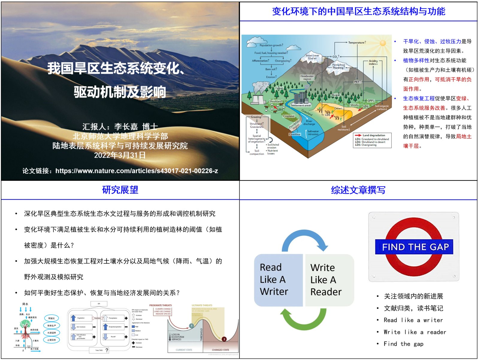 李长嘉老师介绍了Nature Reviews Earth & Environment论文《Drivers and impacts of changes in China’s drylands》(我国旱区生态系统变化、驱动机制及影响)(文章链接://doi.org/10.1038/s43017-021-00226-z)。该研究发现1982-2015年中国旱区有45.8%的区域呈现植被显著变绿,11.4%的区域植被显著变棕。干旱对植物多样性、植被生产力和土壤有机碳呈负向影响;植物多样性对植被生产力和土壤有机碳有正向促进作用。风蚀、水蚀、冻融侵蚀是导致我国旱区荒漠化的关键过程。此外,李长嘉老师还介绍了我国多项生态保护与修复工程对旱区植被变绿、土地退化的改善和固碳等生态系统功能的提升的重要作用。该研究基于旱区相关研究的全面系统分析,提出了未来研究方向,对中国旱区相关研究的发展及人地系统耦合的认识具有重要意义。随后,李长嘉老师分享了综述论文撰写经验,从文章投稿、地学领域相关综述期刊等方面进行介绍,并建议同学们关注领域内进展,做好文献阅读笔记,同时要把写作和阅读有机结合起来。