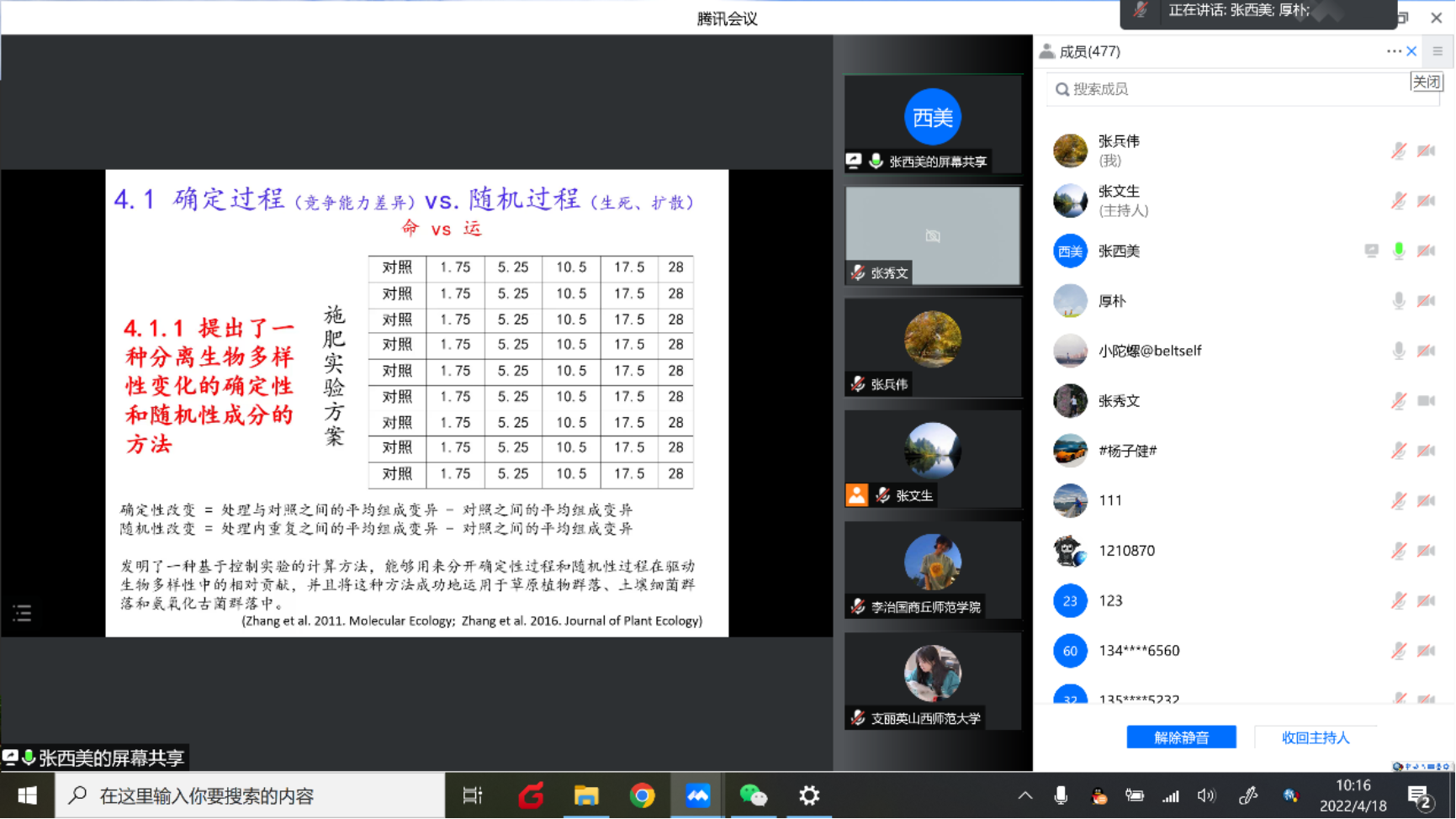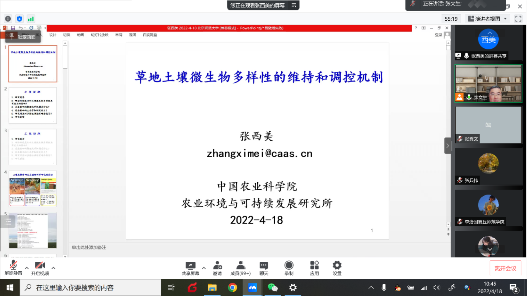 2022年4月18日上午,2022年资源科学前沿系列讲座第1期成功举办。此次讲座通过线上会议的形式进行,邀请了中国农业科学院农业环境与可持续发展研究所张西美研究员。报告题目为“草地土壤微生物多样性的维持和调控机制”。讲座由张文生教授主持,线上约500名师生参加。
