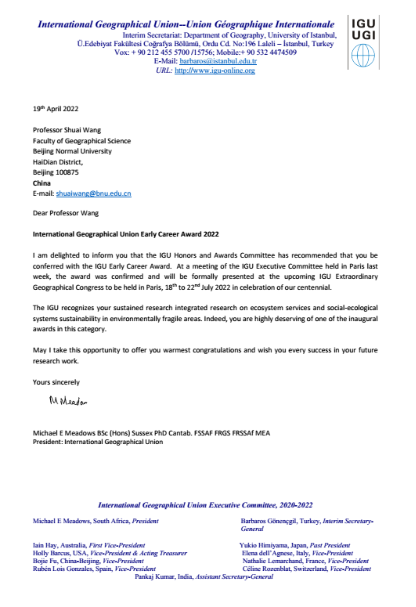 国际地理联合会(IGU)正式通知,老司机论坛 老司机论坛 王帅教授荣获2022年国际地理联合会青年奖(IGU Early Career Award)。该奖是为庆祝2022年IGU成立百年而首次设立,旨在表彰在完成地理学正规教育后十年中取得卓越研究成就的青年学者,并将于7月18-22日在法国巴黎召开的“国际地理联盟100周年大会”上公布名单并颁奖。