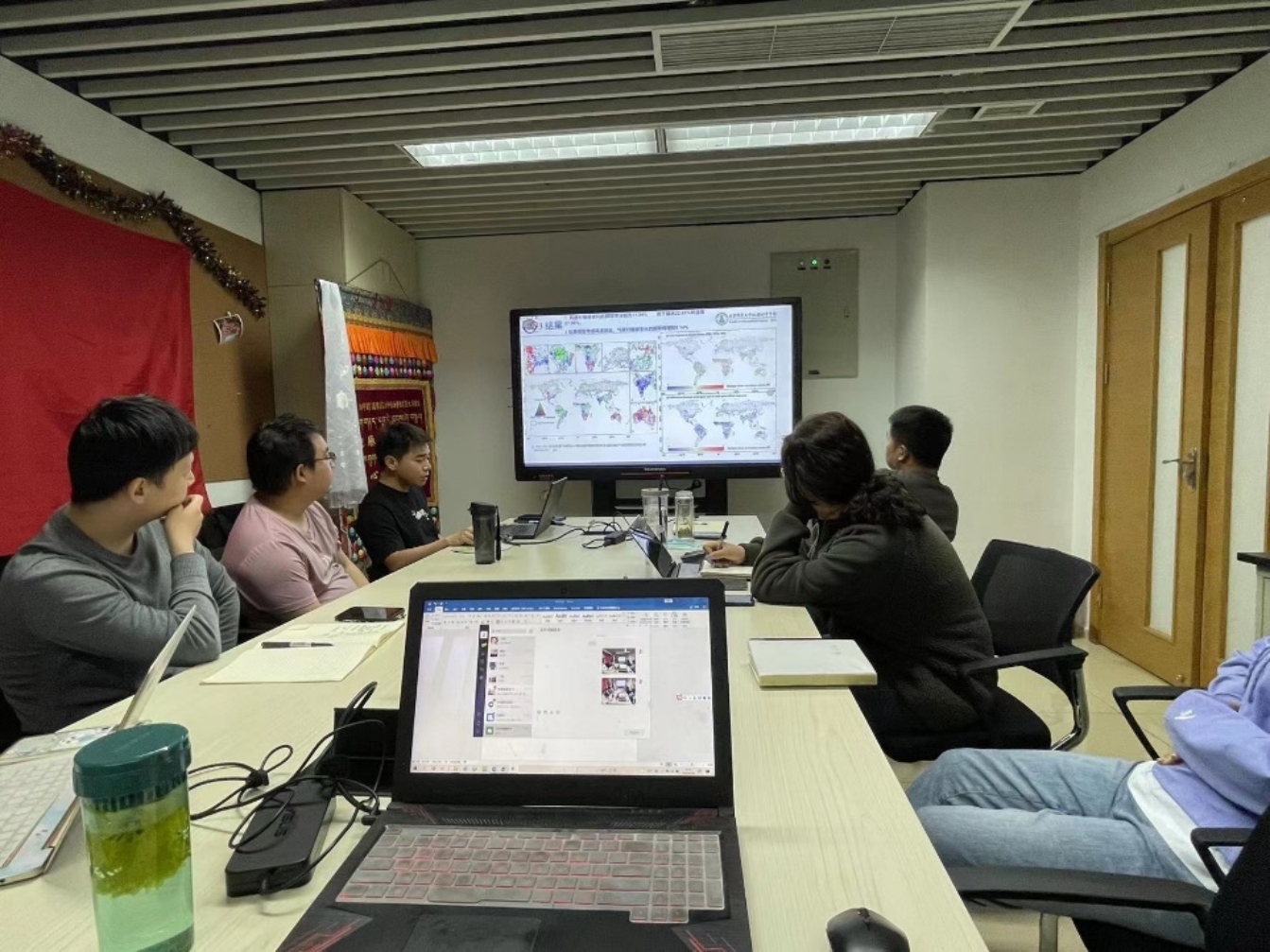 张童同学汇报的题目为“全球风速变化对植被的影响”,他以全球为研究区,通过收集大量数据,并进行数据的分析研究,提出三个拟解决问题:(1)1984年—2013年,全球植被在全球尺度上是退化了还是恢复了?(2)风速变化趋势如何?(3)年际尺度,风速对年际LAI的相对贡献率?,得出结果:(1)年均风速显著降低的区域占比42.32%,增加区域仅占24.83%,年均LAI增加区域占比86.24%(2)风速对植被变化的解释率分别为31.54%,,高于降水22.66%和温度27.96%;(3)如果模型考虑风速效应,气候对植被生长的解释将增加8.14%。汇报完毕张童同学和在场人员展开了讨论,董满宇老师对张童同学的研究进行指导与建议。