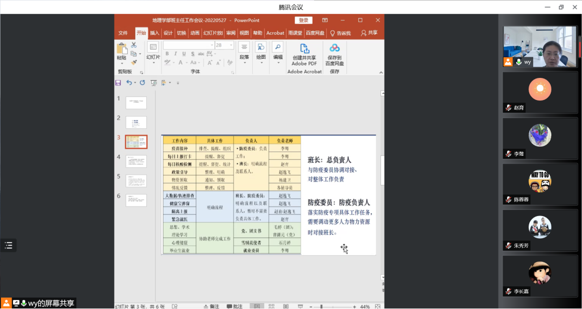 从4月26日以来,校园疫情防控工作持续保持严峻形势,地理学部在各关键时点及时召开班主任工作会、整合发布通知文件,通报最新情况、部署相关工作。自学校启动一级防控以来,学部共召开4次全体班主任老师线上疫情防控专题会议,严格落实“一对一”深度辅导,按时提交辅导台账、安全月报,坚决执行学校、学部的各项政策精神;每天发布学生关切的各项问题反馈及最新政策文件,保障信息通畅。学部党委将在接下来的工作中继续抓好班主任、班长、防疫委员、党团学生骨干等队伍建设,确保同一个方向、同一个声音,筑牢疫情防控战线、打赢疫情防控阻击战!