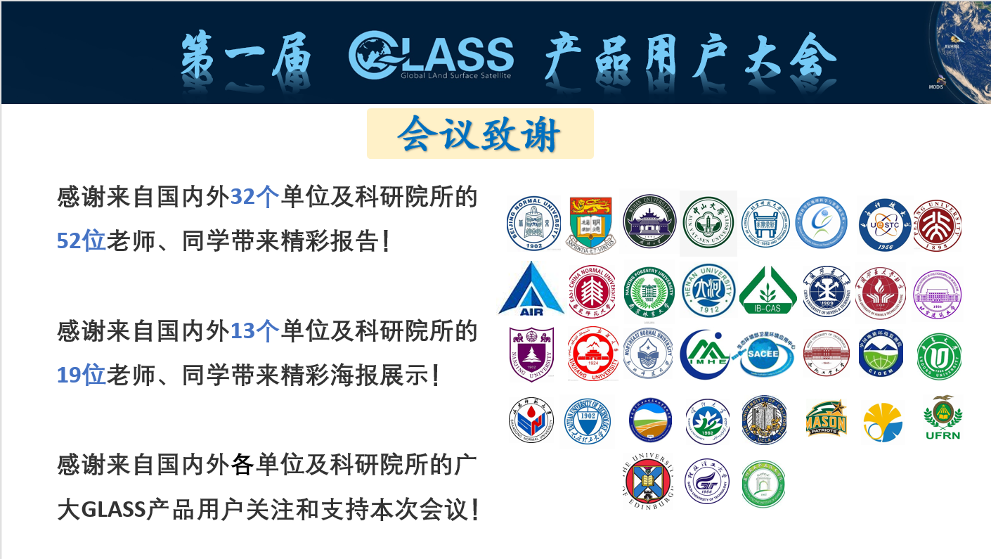 GLASS产品首席科学家梁顺林教授在闭幕式上对本次会议进行了总结,并谈到了GLASS产品未来的发展,一是增加国产卫星数据的使用;二是探索更多的可解译复杂关系的方法;三是产品研发与应用需求更加紧密结合。希望GLASS产品能够得到更多的用户的反馈,使团队在选择产品的研发、产品的一些特性上面能够更好的调整,更好的为用户服务。