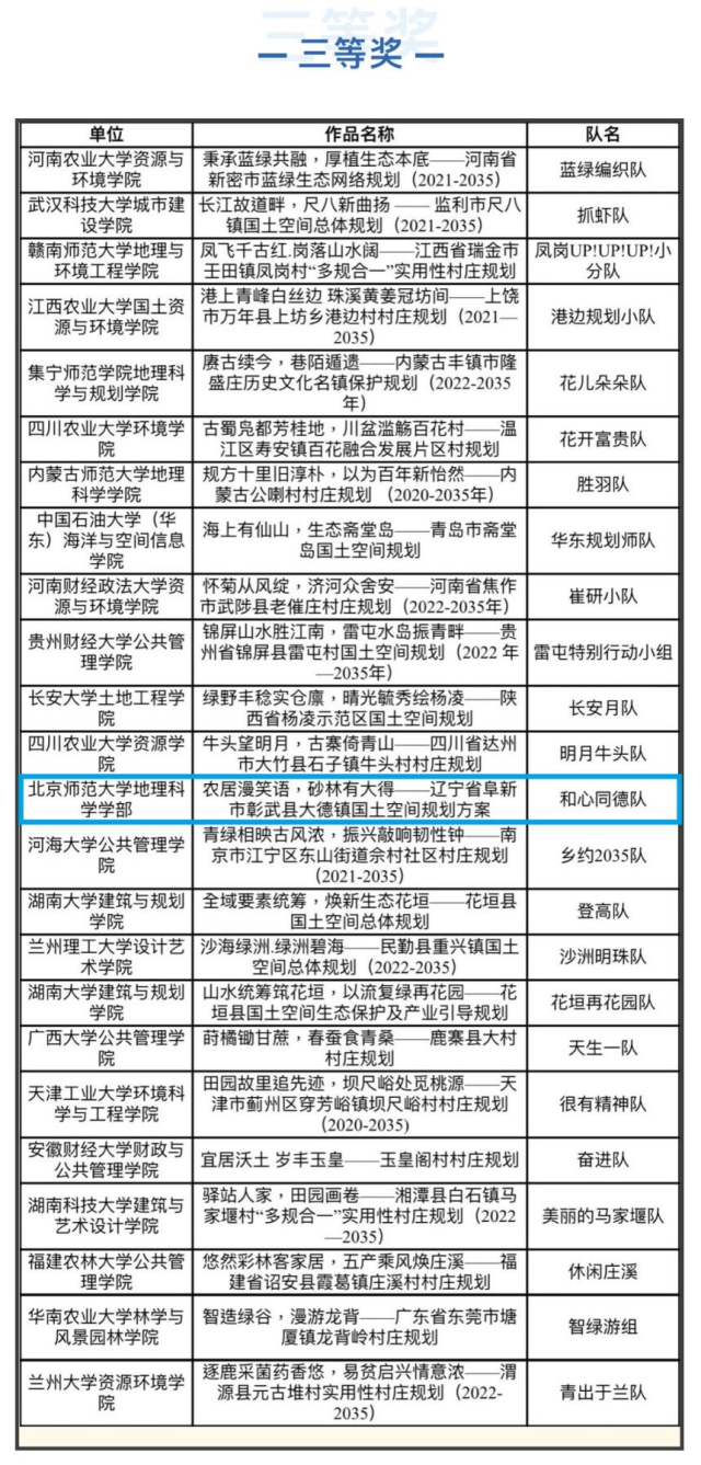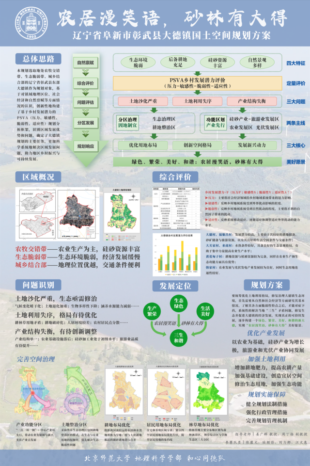 在自然资源学院李强、姜广辉、刘志锋、周丁扬四位老师的全程组织、指导下,从3月份开始,组建参赛团队,确定了选题,制定了工作计划,扎实推进各项备赛任务。期间,经过数十次与老师们的讨论交流,两个参赛团队完成资料收集、实地调查、数据分析与评价、作品编写等工作,如期提交了参赛作品:“农居漫笑语,砂林有大得——辽宁省阜新市彰武县大德镇国土空间规划方案”与“昔日扶京首善地,今朝兴教宜居城——北京市昌平区沙河镇村镇总体规划”。7月5日,大赛组委会正式公布决赛入围名单后,参赛团队师生又共同组织了多场作品汇报与预答辩,为决赛做了充分准备。7月16日,队长张露文代表全队进行了决赛汇报与答辩,凭借出色的规划作品与稳定的现场发挥,在激烈的角逐中脱颖而出,获得三等奖。