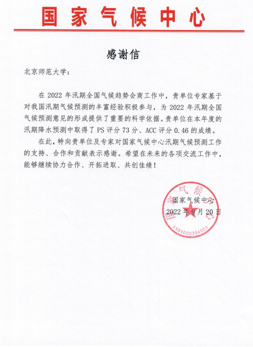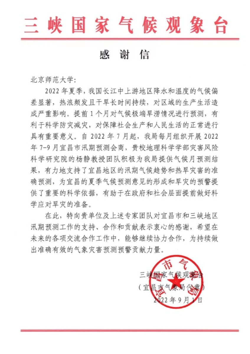 同时,2022年夏季,该团队也受邀为三峡国家气候观象台每月组织开展的7~9月宜昌市汛期预测会商提供月预测结果,有力地支持了三峡地区的汛期气候趋势和热旱灾害的准确预测,有助于相关部门在政府和社会层面提前做好科学应对旱灾的准备。三峡国家气候观象台特此发来感谢信,感谢北师大地理学部灾害风险科学研究院对宜昌市和三峡地区汛期预测工作的支持和贡献,也期待进一步的合作。