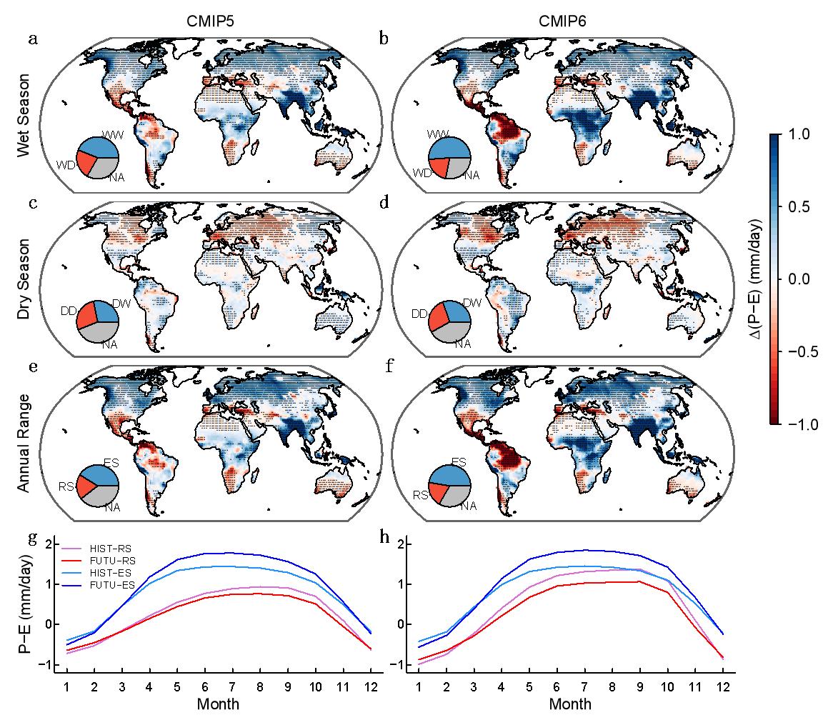 图1.未来地表可用水量(P-E)季节变化特征。(a-f) 未来高排放情景下P-E季节变化特征,蓝色表示变湿或季节变率增强(ES),红色表示变干或季节变率减弱(RS);(g-h) 历史和未来时期P-E季节变化曲线(横轴1表示干季第一个月)。
