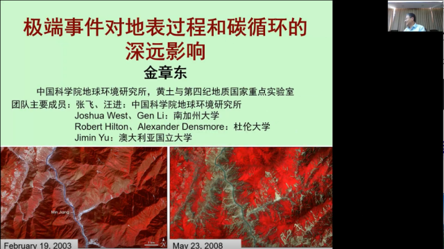 金章东老师在报告中系统地介绍了地震这种极端事件对地表径流、河流泥沙、颗粒物质沉积及碳循环过程的影响。首先,他详细地对比了2008年汶川地震事件发生前后岷江、沱江和涪江流域河川径流及悬浮和沉积颗粒物质的变化,阐述了水库沉积物磁化率对其沉积过程的指示作用,揭示了地震产生的滑坡堆积物质运移过程及其对河流颗粒物质沉积的影响。其次,对于地震对河流颗粒有机碳的影响,他指出地震发生后岷江、沱江和涪江流域河流颗粒有机碳显著增加,其中40%左右颗粒有机碳可能被氧化,以CO2形式释放到大气中,60%左右颗粒有机碳被沉积埋藏,表明地震的发生增加了河流沉积通量和有机碳的埋藏速率,促进了区域的碳汇过程。