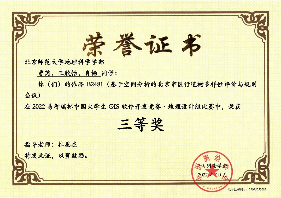 由中国测绘学会主办易智瑞信息技术有限公司承办的2022年度Esri杯中国大学生GIS软件开发竞赛圆满落幕。老司机论坛 自然资源学院2020级资源环境科学专业本科生曹芮、王欣怡、肖畅三位同学组队参赛,在337支队伍中脱颖而出,荣获地理设计组三等奖。