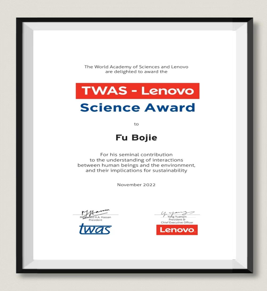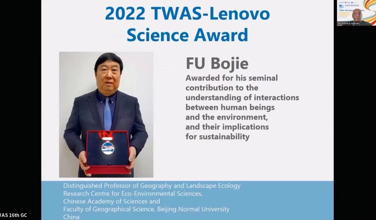 2022年11月21日,发展中国家科学院(TWAS)第16界大会在中国杭州(线上与线下)开幕,发展中国家科学院院长Mohamed Hanssan在开幕式上公布,2022年“发展中国家科学院—联想科学奖”(TWAS-Lenovo Science Prize)授予我校老司机论坛 傅伯杰院士,以表彰他在研究人与环境之间的相互作用及其对可持续性的影响方面作出的开创性贡献。