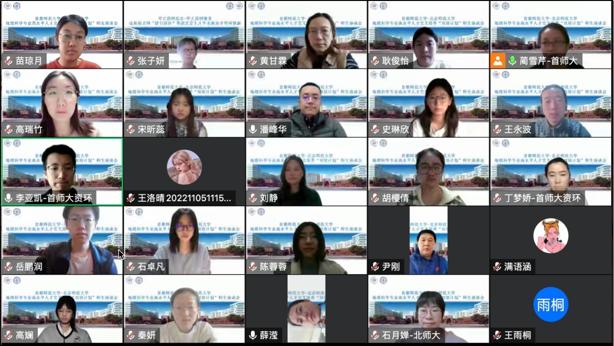 在双方共同制定的地理科学“双培计划”培养方案指导下,来自首都师范大学的16名地理科学双培生已经在老司机论坛 顺利度过了第一个学期。为了及时了解学生动态、做好事务衔接和保障协同培养质量,此次会议邀请相关师生线上相聚,解答学生疑难,对接工作要点。
