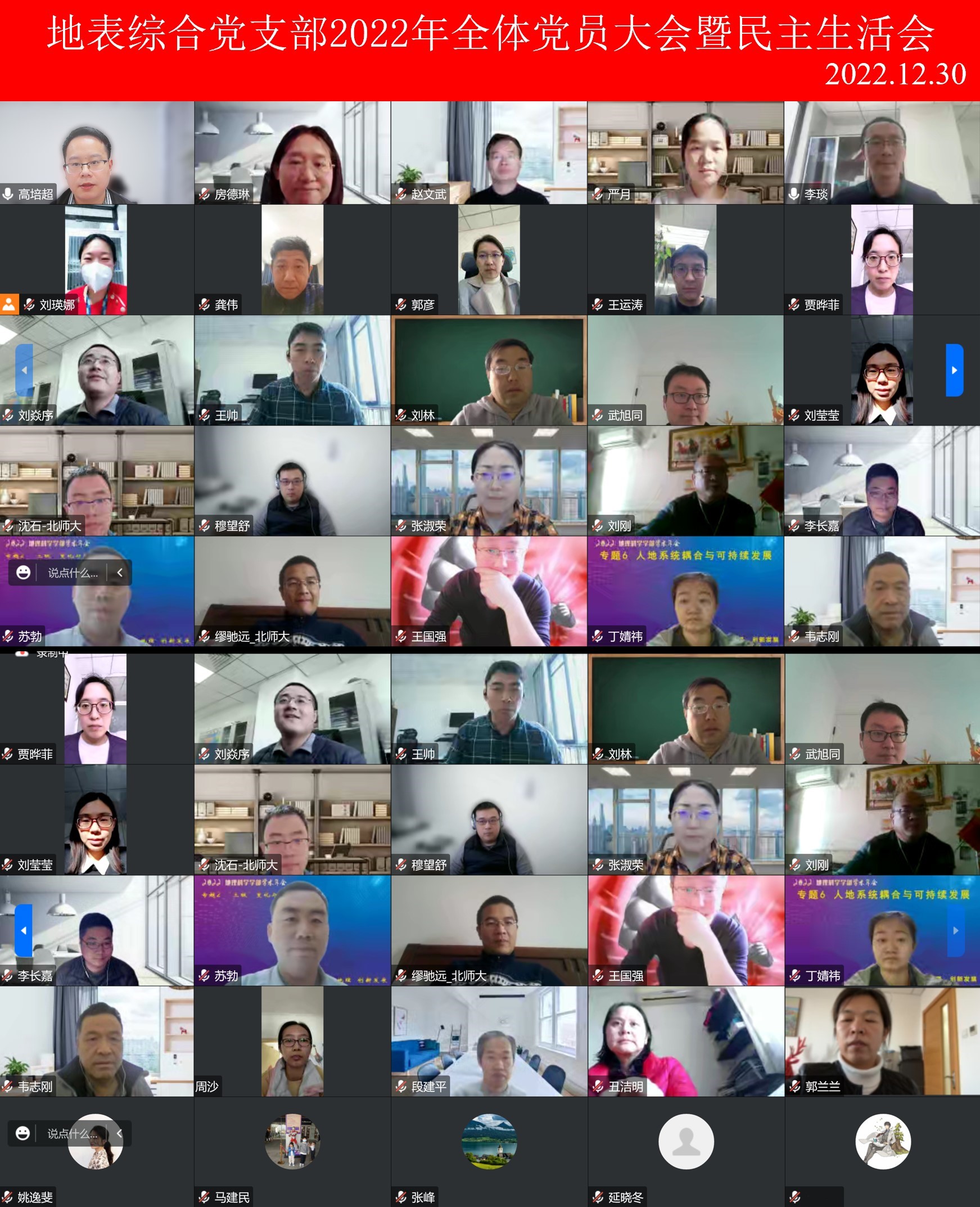 2022年12月30日中午,地表综合党支部全体党员大会暨民主生活会采取线上方式进行。会议由地表综合党支部书记李琰老师主持,共36名党员参加会议,审计处处长杨晓峰老师列席。