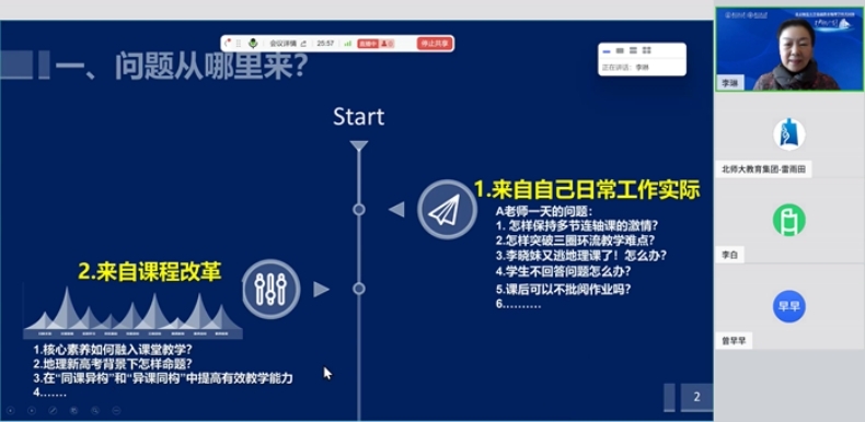 专题讲座后,与会老师围绕“聚焦中学地理教学问题确定选题方向,针对选题选择研究方法”主题进行了分组讨论与汇报,由李琳教授和曾早早副教授共同主持。