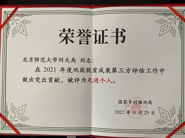 2021年2月25日,我国宣布脱贫攻坚战取得全面胜利。为进一步巩固拓展脱贫成果、实现与乡村振兴战略的有效衔接,国家乡村振兴局(原:国务院扶贫办)启动巩固脱贫成果第三方评估,刘学敏教授团队于2021年末承担了吉林省的评估任务。在刘学敏教授的带领下,以李强、哈斯额尔敦、杜树山、以及其他学部的诸位教授为核心成员,组织学部和其它高校近70位研究生,在2021年12月17日至2022年1月30日期间,经过前期准备、实地评估、报告撰写等过程,圆满完成吉林省的第三方评估工作。尽管遭遇-30°以下的极寒天气, 尽管山路崎岖遥远,尽管在极度疲劳中度过跨年夜,全体师生一如既往地全身心投入工作,展示出团队一贯的优良作风,再次赢得国家乡村振兴局的高度评价,获得先进集体奖。同时,李强教授、博士生刘天禹获得先进个人奖。