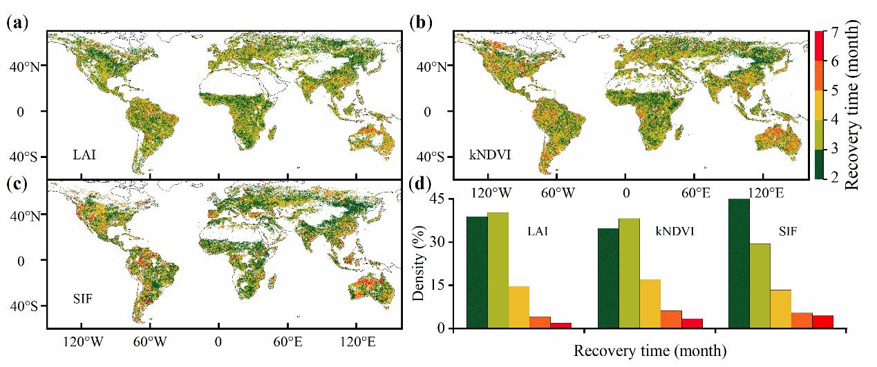 结果发现,基于LAI、kNDVI和SIF评估的陆地生态系统的平均干旱恢复时间分别是3.22、3.39和3.19个月。接近80%的生态系统在4个月内恢复正常,然而,北美西南部、南美洲南部、地中海、欧亚大陆中部、东南亚以及澳大利亚可能需要5个月或更长时间才可以恢复。