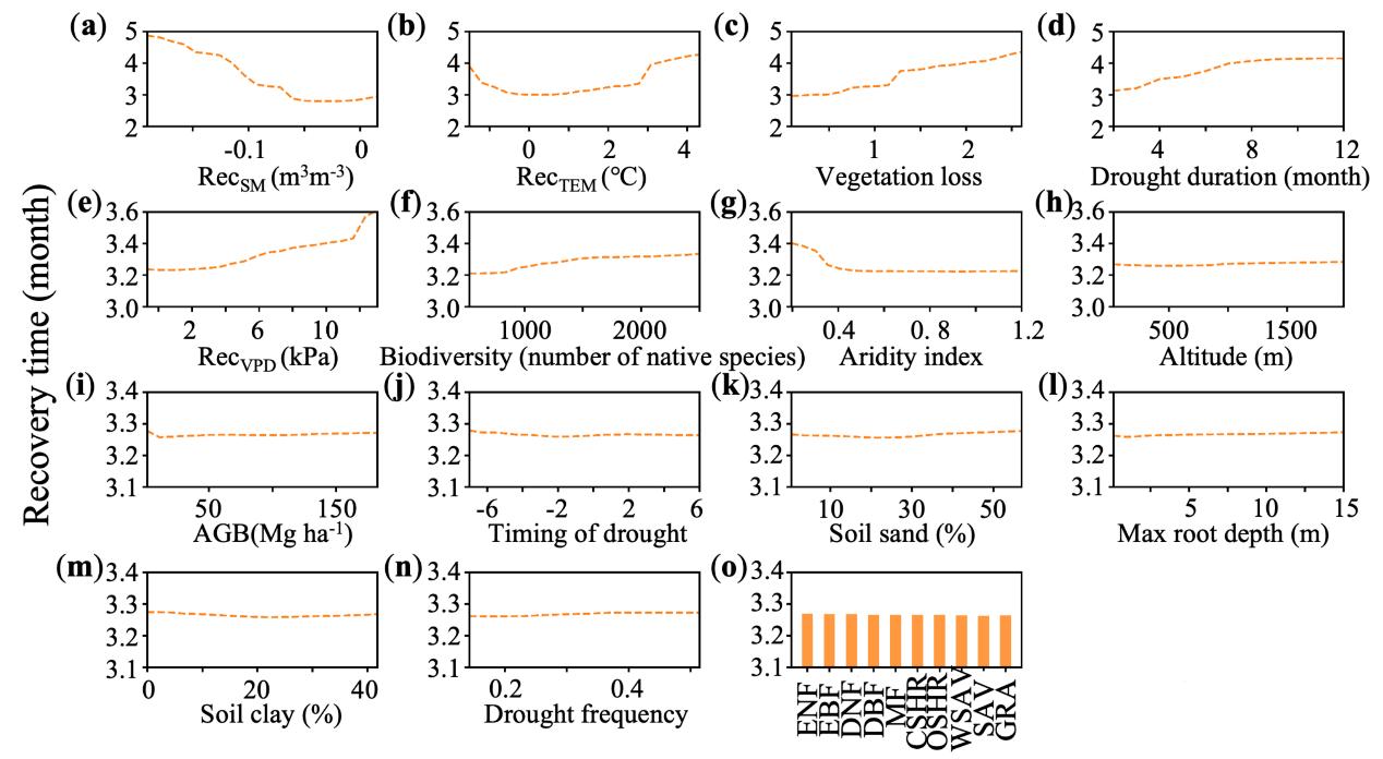 恢复期土壤水(RecSM)是影响恢复时间的最主要因素,干燥的土壤条件延长了恢复时间(图2a)。恢复时间对温度的响应是非单调的,更热或者更冷的恢复期间温度都不利于生态系统从干旱中恢复(图2b)。干旱对生态系统的破坏越严重或生态系统经历的干旱持续时间越长都会导致更长的恢复时间(图2c, d)。干旱大气环境不利于生态系统的生长,随着恢复期饱和水汽压差(RecVPD)的增加,恢复时间延长(图2e)。值得注意的是,干旱发生的时间会影响恢复时间,即发生在植被峰值月份之前的干旱导致更长的恢复时间(图2j)。此外,土壤成分对恢复时间也有影响,砂土含量高或粘粒含量低的地区恢复时间较长(图2k, m)。