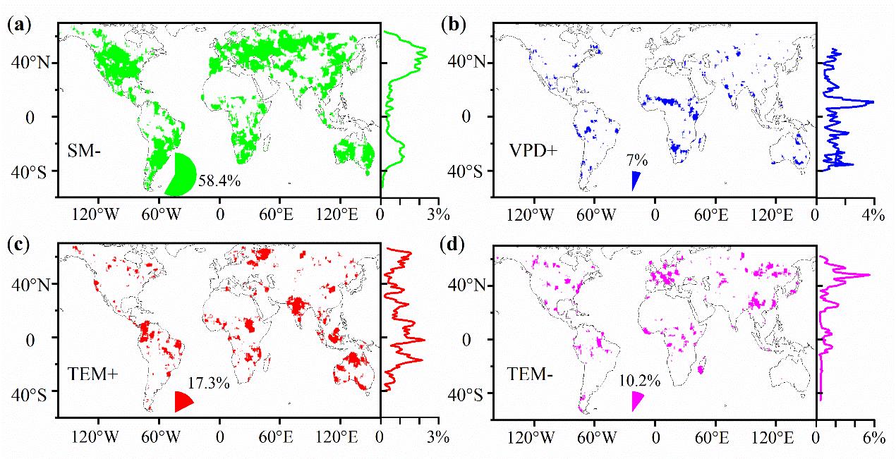 SM-区域主要集中在中纬度地区,占研究区域的58.4%,包括北美中南部、南美南部、非洲南部、地中海地区、欧亚中部、中国东部和澳大利亚(图3a)。VPD+区域集中在低纬度,分布在撒哈拉南部、非洲南部和澳大利亚东部 (图3b)。在27.5%的生态系统中,温度对恢复时间发挥主导作用。恢复时间主导因素空间格局的形成由区域水热组合决定。