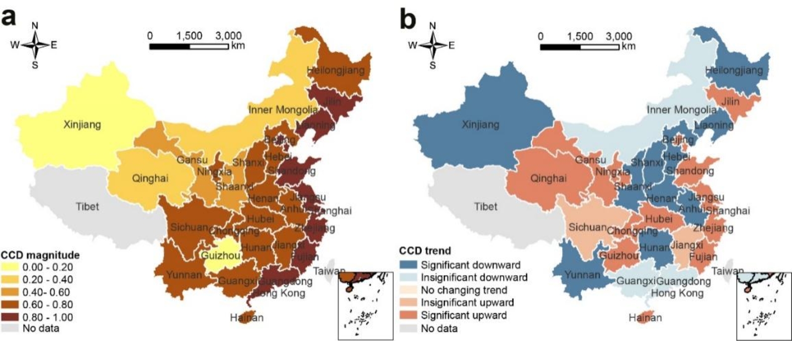 图4 2000-2018年中国区域环境绩效与人类福祉耦合协调度的大小(a)和变化趋势度(b)。