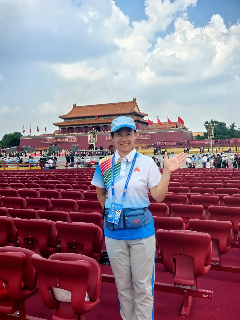 非常荣幸能够在观礼台参与志愿服务,并近距离聆听习近平总书记的重要讲话。“中华民族伟大复兴势不可挡,人类和平与发展的崇高事业必将胜利!”这句话让我心潮澎湃、热泪盈眶。那一刻,八十天志愿者集中培训中的所有付出,都凝聚成了无比清晰的意义,一切坚持都在此刻升华。我们每一个人都被深深点燃,被那整齐雄壮的队伍所震撼,被血脉中奔涌的家国情怀所感动,被“正义必胜、和平必胜、人民必胜”的庄严宣告所激励。八十年后的今天,最好的纪念,莫过于秉承先辈的信念,将他们曾经誓死守护的土地,建设得更加繁荣、更加安宁。这是我们这一代人的责任,也是最深情的告慰。