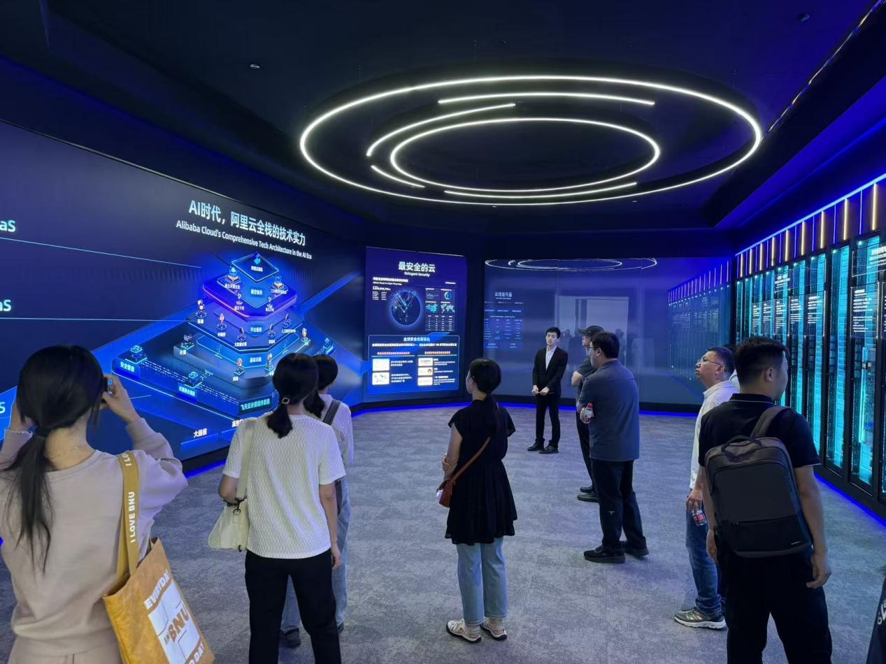 第一环节,学部师生通过阿里云科技展厅系统了解了阿里云"立足北京、服务全球"的发展战略,及其在云计算和人工智能领域的技术布局。展厅通过互动演示和案例讲解,生动展现了云计算的三次技术浪潮,以及阿里云在AI时代构建的全栈技术能力,该项技术已成功支撑奥运会等国际大型赛事的数字化转型。展厅还重点展示了通义大模型家族的最新成果,介绍了通义灵码、智能机器人、智能眼镜等创新应用。同时,阿里云"让科技更普惠、更可持续"的企业愿景, 也引发了师生们的深入思考。