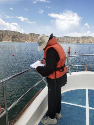 科考队员在龙羊峡水电站开展对比测量(水库水面(左),水库外(右))