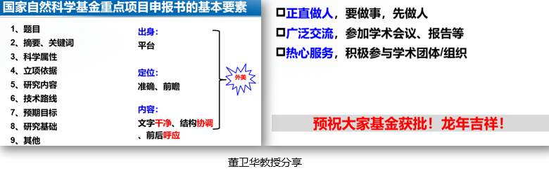 董卫华教授作了“国家自然科学基金重点项目申报的几点认识”的报告,从选题、摘要、科学问题属性、立项依据、现状分析、研究内容、研究方案、研究基础和简历等方面进行了详尽分析,分享了各部分申报要点以及正直做人,广泛交流和热心服务的宝贵经验。