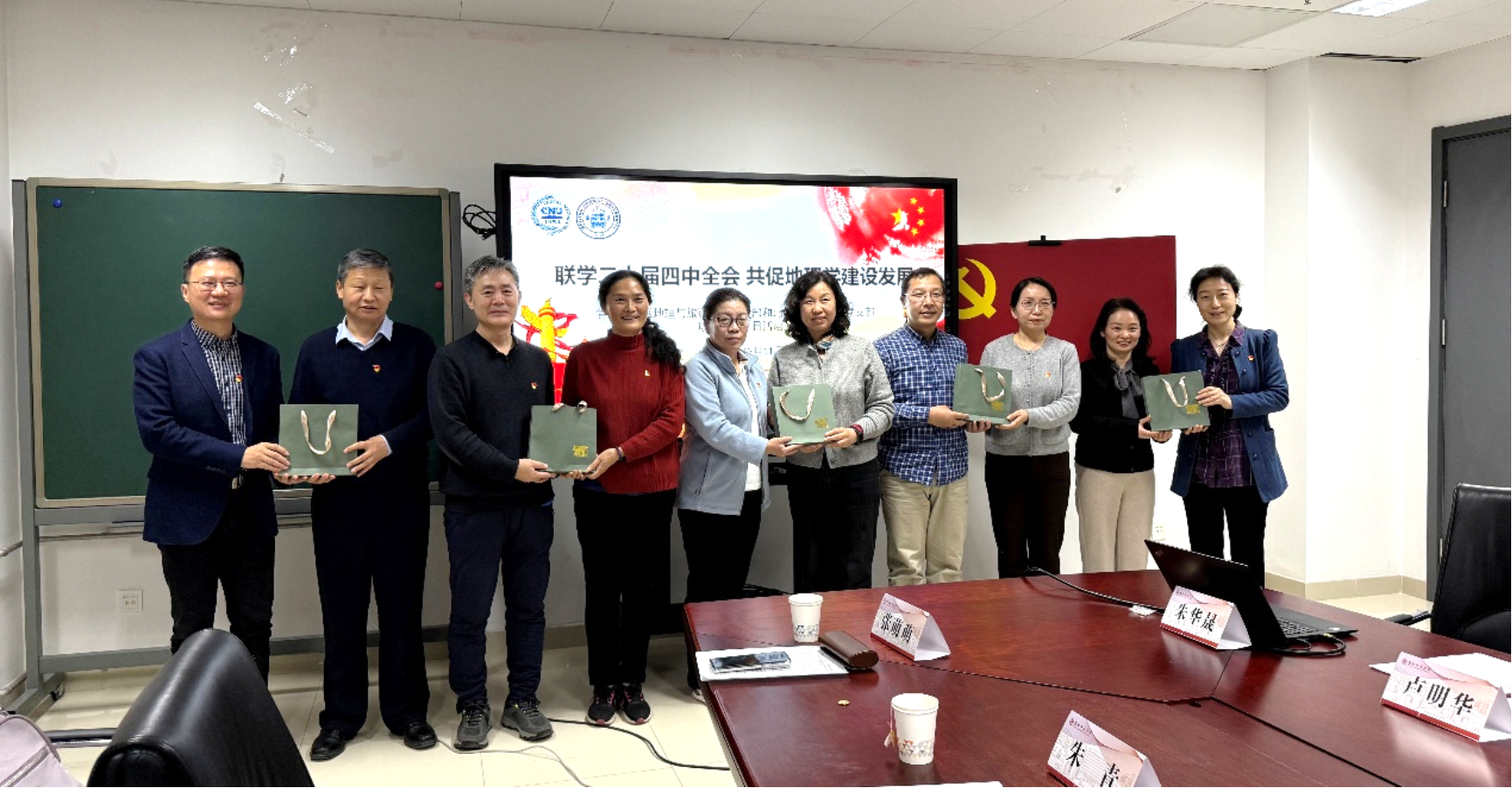 在随后的交流研讨环节,现场气氛热烈。双方教师紧密结合党的二十届四中全会精神,就共同关心的党建专业融合实践、高水平教学团队建设、国家自然科学基金申报、人工智能技术在地理学中的应用、以及本硕博一体化人才培养与野外实习基地建设等具体内容交换了意见。为表达两院友谊,我院教师代表还向首师大同仁赠送了学院教师出版的成果著作和学部文创纪念品。