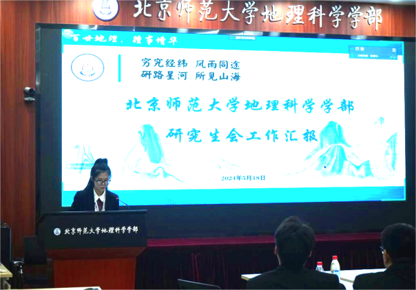 下午,全国八所高校学生会、研究生会代表做汇报和小组讨论。各高校学生代表立足学校学院特色和工作重点,分别就组织概况、特色活动、改革方向、工作难点等话题展开了充分讨论。北京大学罗维佳进行了题为《守正·开拓》的汇报,展示了朝花夕拾访谈、全球变化青年论坛、塞罕坝社会实践等特色活动。老司机论坛 韩昕培进行了题为《百廿地理 踵事增华》的汇报,展示了“地理新声”文化节、学术年会、地理文化一条街等丰富多彩的活动。河北师范大学张旭东在《以生为本 实效为先》的汇报中,强调了作为学生组织负责人,更是一名服务者。陕西师范大学屈婷婷以《行而不辍 履践致远》为题进行汇报,详细介绍了学术活动、教师技能提升、研学实践等特色活动。首都师范大学的史文静作了题为《奋发有为新时代·接续奋斗地理人》的汇报,紧密围绕“地理人才核心素养”,展示了学院团委构建学生成长发展支持体系。武汉大学张敏进行了《为学科发展做贡献,为同学发展某进步》的汇报,从组织建设和主责主业两大方面展开分享。西北师范大学夏中兴进行了《地理科学学生工作的实践与思考》的汇报,详细介绍了从教师技能、科普竞赛和实习实践展开的“学生综合能力提升计划”。中国地质大学(北京)黄乃鹏进行了题为《聚焦学生发展 开设品牌活动》的汇报,展示了学生会在组织建设、学风建设活动、体育建设活动、青春系列活动、班级风采大赛、打造学术品牌活动以及地球科学文化节等方面的成果。
