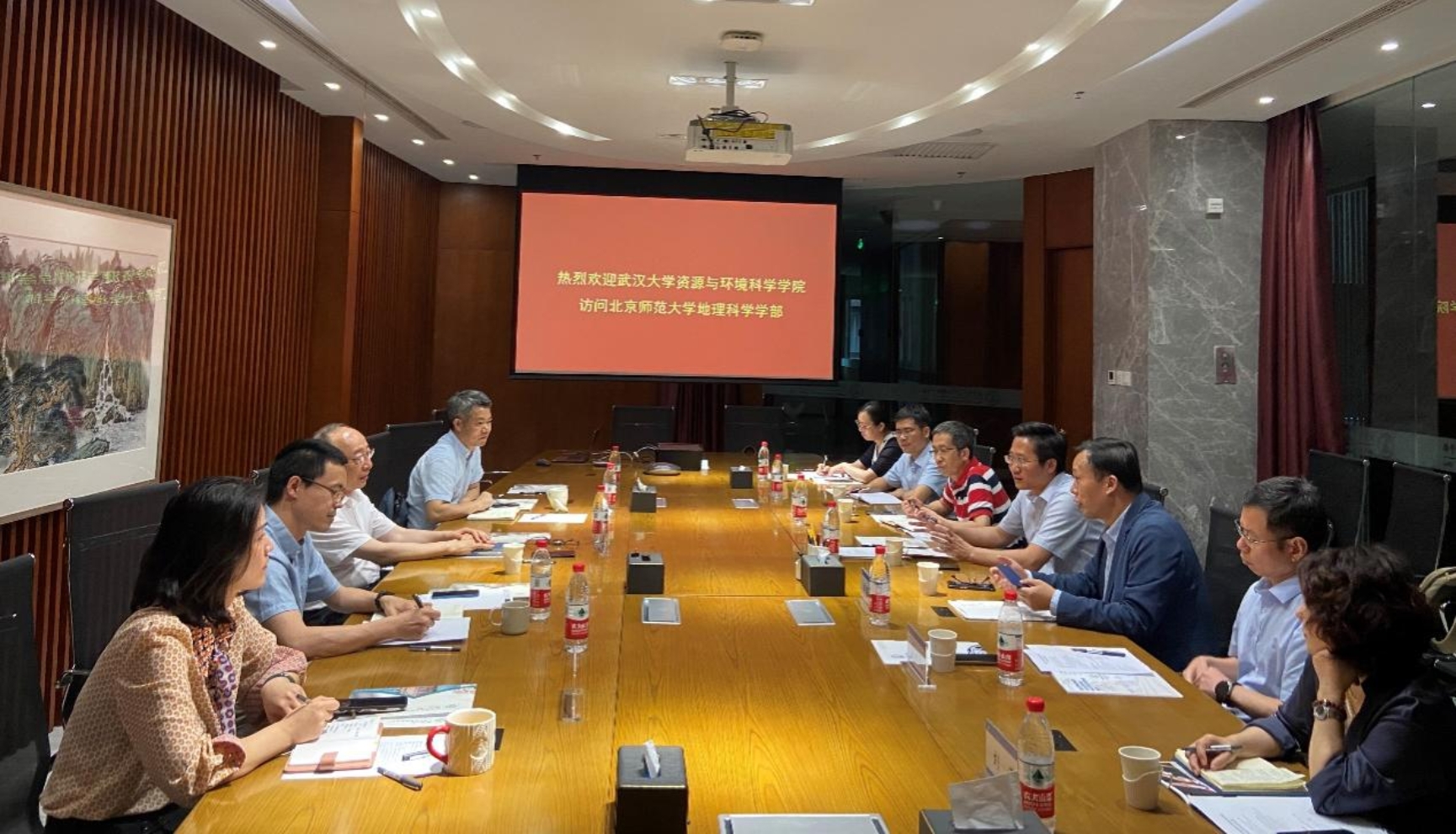 宋长青部长对武汉大学资源与环境科学学院一行来访表示热烈欢迎,他强调武汉大学地理学具有鲜明特色,在地理技术层面上的发展和成绩,值得北师大学习。刘耀林主任表示,武汉大学地理学从发展之初到现在一直得到国内兄弟院校的支持,希望通过本次调研交流,推动武汉大学地理学继续向前发展。随后,沈焕锋院长介绍了武汉大学资源与环境科学学院概况以及本次调研的主题。最后,双方在拔尖人才培养、有组织的科研、师资队伍建设等方面进行了深入交流。