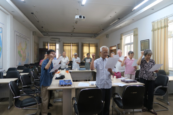 2017年6月27日上午在生地楼180会议室,地理学部分党委离退休教职工党支部举办了 “不忘初心 牢记誓词” 主题党日活动。会议由支部书记郑新生老师主持,离退休支部党员到会15人,其中12人在80岁以上,最大的89岁,最小的67岁,平均年龄80.9岁。