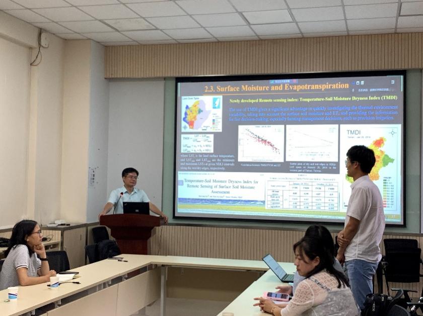 面对全球气温上升、水文循环变化及自然灾害频率增加等全球环境变化问题,刘说安院士提出了一系列前沿的研究方法和观点。此次报告内容包括台风、干旱和水灾等水文气象灾害和环境生态问题,他强调了遥感和人工智能技术在多个领域中的应用潜力。在台风研究方面,刘说安院士详细解释了两个热带气旋如何相互影响,并引入了Liou-Liu公式,这一算法有助于更准确地预测台风路径和强度。报告还探讨了季节性环境因素如何影响台风强度,这一研究有助于更全面地理解台风的生成和发展。报告介绍了一种新的台风轨迹预测方法,该方法基于长短期记忆网络(LSTM),能更准确地预测台风路径。在干旱研究方面,刘说安院士开发新指数,包括归一化差异潜热指数 (NDLI) 和温度土壤水分干燥指数 (TMDI) ,可以精确分析地表水可用性和热状态,在干旱评估方面显示出优势。报告还涉及生态脆弱性评估、土壤盐度分析及空气质量评估等方面。报告结束后,现场师生就如何开展有效开展台风监测与预测、干旱监测、模式与遥感相结合的前沿方向、AI技术未来的发展等议题与刘院士进行深入的学术交流。