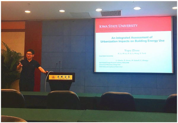 2017年7月19日上午,应何春阳教授邀请,美国爱荷华州立大学地质与大气科学系助理教授周宇宇博士来访,并在京师大厦第一会议室作了题为“An Integrated Assessment of Urbanization Impacts on Building Energy Use”的学术报告。陈云浩教授、陈学泓副教授、黄庆旭副教授、刘志锋博士和朱孝林博士等近40位师生参加了报告会。报告会由何春阳教授主持。