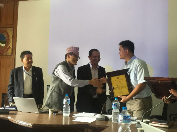 2017年8月21日,汪明教授、刘凯副教授受邀参加了由尼泊尔国家恢复重建局、城市发展部城市发展与建设司、特里布文大学工学院和尼泊尔国家地震技术协会共同举办的技术咨询会,汪明教授代表项目组全面汇报了石砌体加固技术的方案,得到与会人员的高度肯定。会上,尼泊尔国家重建局首席执行官GOVIND RAJ POKHAREL博士为汪明、刘凯颁发了嘉奖状。