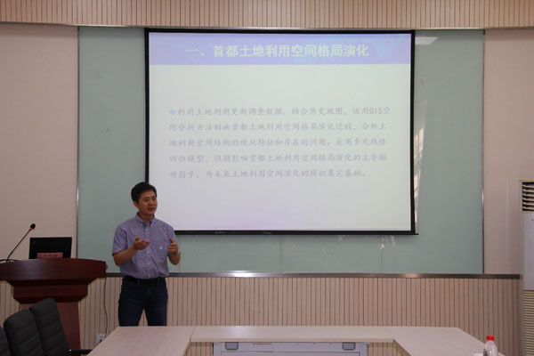 宋金平教授结合自己的国外访学成果和过去长期的研究,进行了题为《首都土地利用空间格局演化与模拟》的学术报告。宋老师通过土地利用更新数据和使用遥感技术,系统分析与探讨了北京市土地利用的空间格局特征、演变过程、存在的主要问题和驱动因子,以及通过对北京市人口和就业空间格局的演变研究,进一步分析了土地利用变化对居民居住-就业空间关系的影响,最后对不同情境下的北京市土地利用格局进行了模拟。