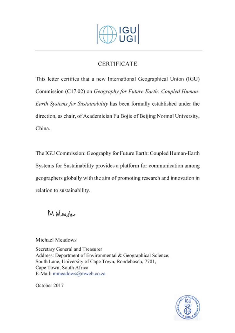 为推动地理学综合研究,服务于未来地球研究计划与全球可持续发展,我校傅伯杰、宋长青、赵文武等教授联合未来地球研究计划科学委员会主席澳大利亚科工组织Mark Stafford Smith等国际著名学者,于2017年8月正式向国际地理学联合会提出成立IGU-GFE委员会的提议。2017年9月,国际地理联合会执委会讨论通过设置该委员会。 日前,国际地理联合会致信傅伯杰院士正式确认成立IGU-GFE委员会。IGU-GFE委员会将面向未来地球研究计划,聚焦人地系统,整合自然地理学、人文地理学、生态学、水文学、大气科学、全球变化、系统模拟、社会科学等学科知识,引领全球地理学工作者寻求探索人地系统耦合方法与可持续发展的新路径。该委员会将按照国际地理联合会章程,联合全球地理学工作者,以推动地理学综合研究和服务全球可持续发展为使命,推动学科交叉融合,加强与其他国际组织和委员会的交流合作,参与国际科学研究计划,举办系列学术会议与论坛,为全球地理学工作者提供学术交流平台,推动实现全球协同与可持续发展。