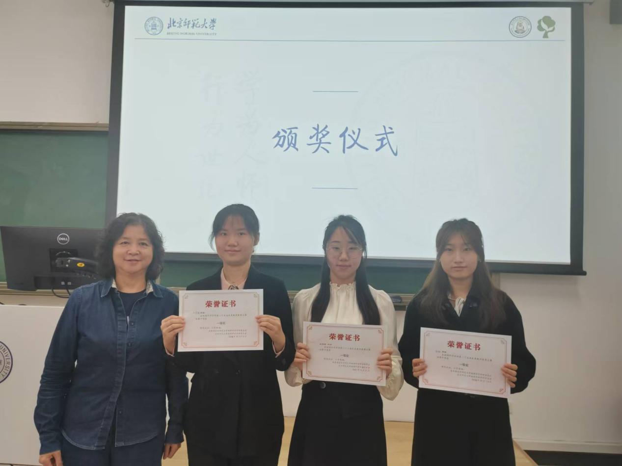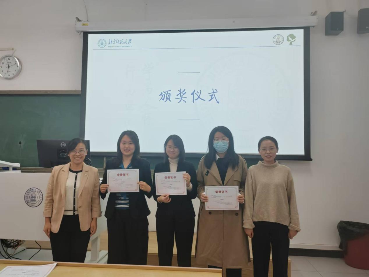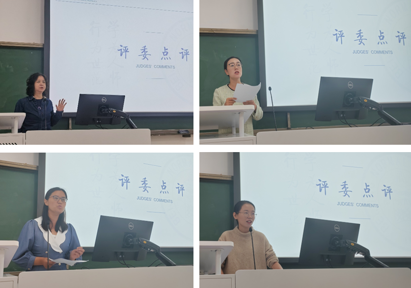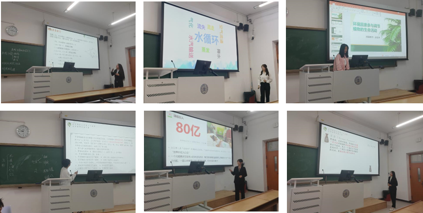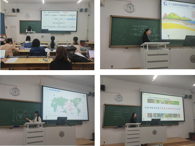 随后是研究生组的教学展示,郝凤麒、宋知霖、段雨新和陶拓抒同学分别以《自然地理环境的整体性》《地球的内部圈层》《洋流的分布规律》《主要的气候类型》为主题进行讲解,郝凤麒以新仙女木事件贯穿课程,给大家留下了深刻的印象;宋知霖同学用有趣的课堂导入,激发学生对于地球内部结构的兴趣,师生互动频繁,富有感染力;段雨新同学在黑板上手绘简版世界地图,绘制洋流分布和过程,令评委和在场同学印象深刻;陶拓妤同学用世界各地不同的植物引出气候类型这一讲授主题,贴近生活。