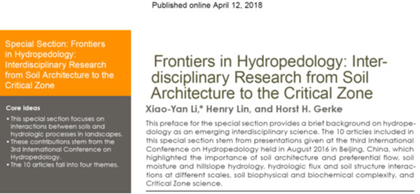 自然资源学院李小雁教授牵头担任客座主编,近日组织出版了《Vadose Zone Journal》专刊Frontiers in Hydropedology: Interdisciplinary Research from Soil Architecture to the Critical Zone该专刊基于第三届水文土壤学国际会议(北京,2016年8月16-19日)的交流论文,经严格同行评审后精选论文10篇,涵盖“土壤结构与壤中流”、“地下水-地表水相互作用”、“土壤水文数据库与模型模拟”和“地球关键带研究”4个主题。《Vadose Zone Journal》是美国土壤学会老牌期刊,是土壤学和水文学交叉学科及地球关键带科学研究方面的国际知名期刊。